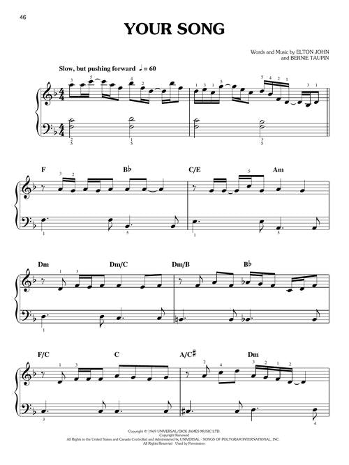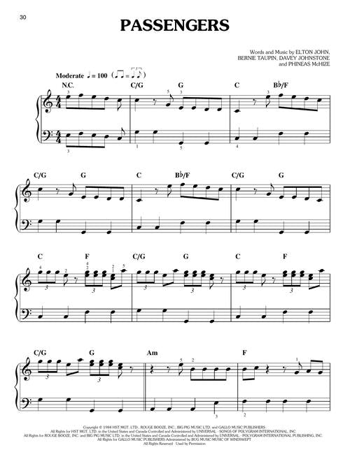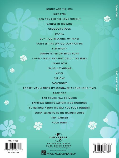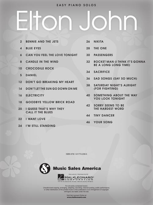 Over 20 of Sir John's best arranged for the beginning player, including: Bennie and the Jets · Can You Feel the Love Tonight · Candle in the Wind · Crocodile Rock · Don't Go Breaking My Heart · Don't Let the Sun Go down on Me · Goodbye Yellow Brick Road · I'm Still Standing · Rocket Man (I Think It's Gonna Be a Long Long Time) · Sacrifice · Saturday Night's Alright (For Fighting) · Tiny Dancer · Your Song · and more.