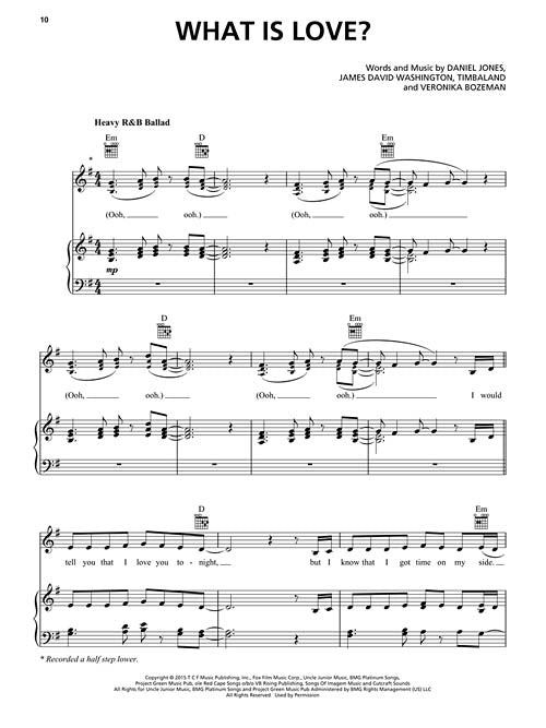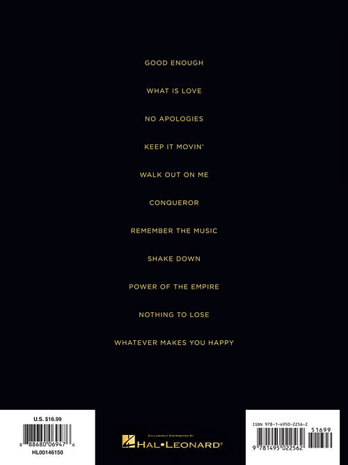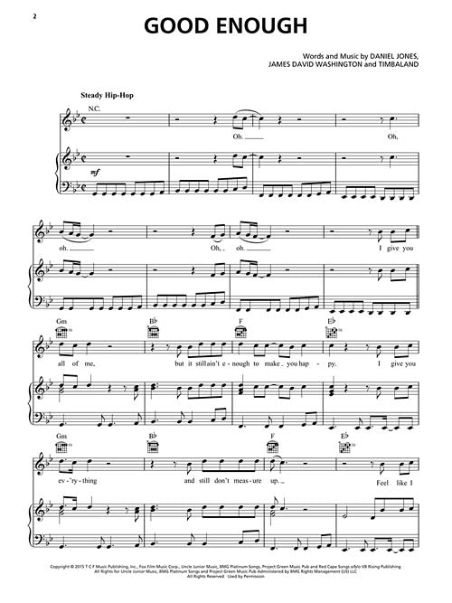 Timbaland produced all 11 songs on this critically acclaimed soundtrack to the inaugural season of the hit FOX TV show Empire. Our folio features piano/vocal/guitar arrangements of all the songs, including: Good Enough (Jussie Smollett) · Power of the Empire (Yazz) · Remember the Music (Jennifer Hudson) · Shake Down (Mary J. Blige & Terrence Howard) · Walk Out on Me (Courtney Love) · What Is Love (V. Bozeman) · and more.
