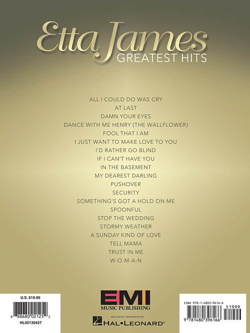 Etta James was known as the matriarch of R&B but her vocal stylings also incorporated the blues, soul, rock and roll, jazz and gospel genres. This book features authentic transcriptions in the original keys of 20 of James' best in voice with piano accompaniment format: At Last · Damn Your Eyes · Dance with Me Henry (The Wallflower) · Fool That I Am · I'd Rather Go Blind · In the Basement · My Dearest Darling · Something's Got a Hold on Me · Stormy Weather · A Sunday Kind of Love · Tell Mama · Trust in Me · and more.