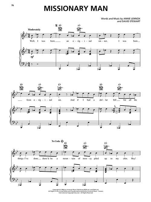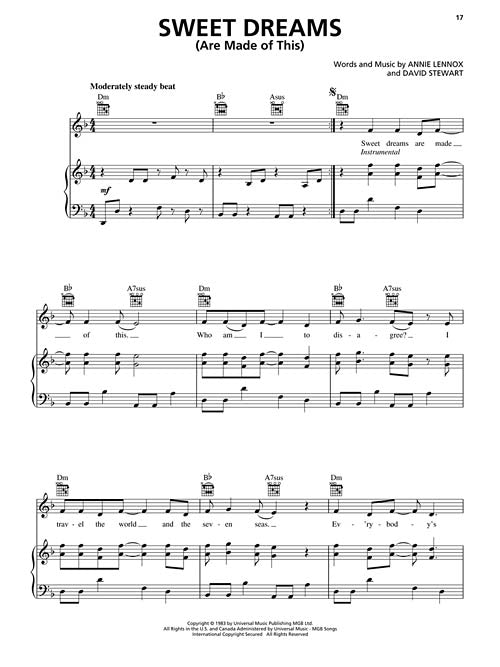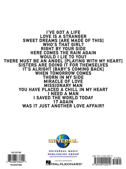 Here are nearly 20 top tunes from this globally adored British pop duo: Here Comes the Rain Again · I Need a Man · Love Is a Stranger · Miracle of Love · Missionary Man · Right by Your Side · 17 Again · Sisters Are Doing It for Themselves · Sweet Dreams (Are Made of This) · There Must Be an Angel (Playing with My Heart) · Was It Just Another Love Affair? · When Tomorrow Comes · Who's That Girl? · Would I Lie to You? · and more.