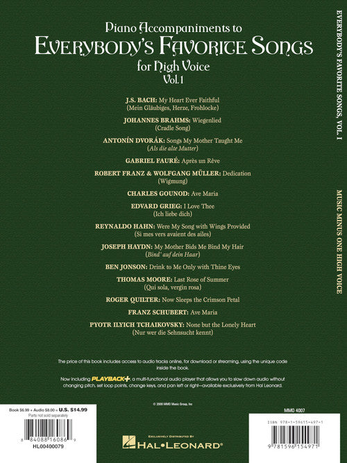 A great collection of the world's favorite songs. Includes titles by such masters as Brahms, Dvorak and Reynaldo Hahn. Includes a printed vocal score and access to professionally-recorded piano accompaniments. The audio is accessed online using the unique code inside each book and can be streamed or downloaded. The audio files include PLAYBACK+, a multi-functional audio player that allows you to slow down audio without changing pitch, set loop points, change keys, and pan left or right. Songs include: J.S. Bach: My Heart Ever Faithful; Johannes Brahms: Cradle Song; Antonin Dvorak: Songs My Mother Taught Me; Gabriel Fauré: Après un Reve; Robert Franz & Wolfgang Müller: Dedication; Charles Gounod: Ave Maria; Edvard Grieg: I Love Thee (Ich liebe dich); Reynaldo Hahn: Were My Song with Wings Provided; Joseph Haydn: My Mother Bids Me Bind My Hair; Ben Johnson: Drink to Me Only with Thine Eyes; Thomas Moore: Last Rose of Summer; Roger Quilter: Now Sleeps the Crimson Petal; Franz Schubert: Ave Maria; Pyotr Ilyich Tchaikovsky: None but the Lonely Heart; and more.