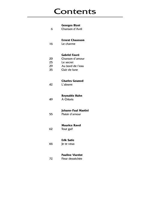 12 songs: Chanson d'Avril (Bizet) · Le charme (Chausson) · Chanson d'amour (Fauré) · Le secret (Fauré) · Au bord de l'eau (Fauré) · Clair de lune (Fauré) · L'absent (Gounod) · À Chloris (Hahn) · Plaisir d'amour (Martini) · Tout gai! (Ravel) · Je te veux (Satie) · Fleur desséchée (Viarddot).