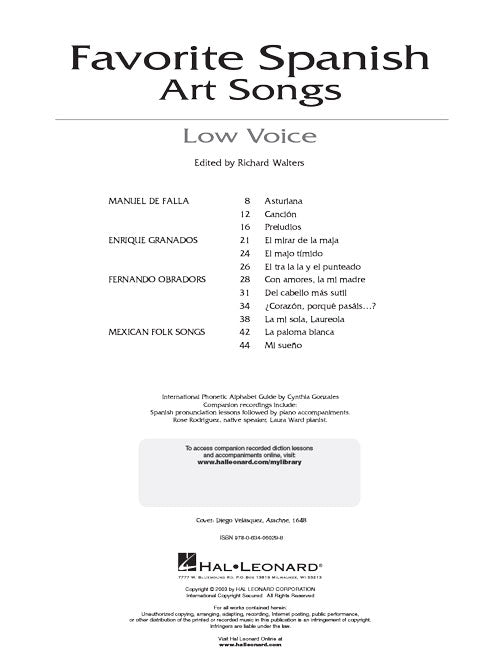 The demand for literature in Spanish is a reflection of our changing American culture. Here are twelve songs in two keys that can serve as an introduction to art songs in Spanish for a voice student. International Phonetic Alphabet is included for each song text, as are translations for study. Contents: DE FALLA: Asturiana · Cancion · Preludios · GRANADOS: El mirar de la maja · El majo timido · El tra la la y el punteado · OBRADORS: Con amores, la mi madre · Del cabello mas sutil · Corazon, porque pasais...? · La mi sola, Laureola · MEXICAN FOLK SONGS: La paloma blanca · Mi sueno