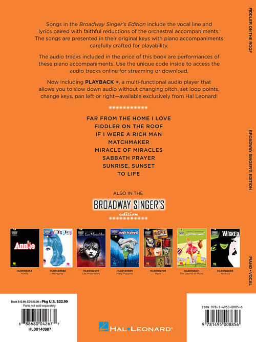 Songs in the Broadway Singer's Edition include the vocal line and lyrics paired with faithful reductions of the orchestral accompaniments. The songs are presented in their original keys with piano accompaniments carefully crafted for playability. The audio tracks included in the price of the book are performances of these piano accompaniments. Includes 8 songs: Far from the Home I Love · Fiddler on the Roof · If I Were a Rich Man · Matchmaker · Miracle of Miracles · Sabbath Prayer · Sunrise, Sunset · To Life.