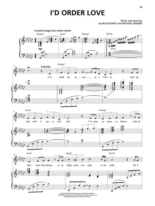 When blind date newbie Aaron is set up with serial-dater Casey, a casual drink at a busy New York restaurant turns into a hilarious high-stakes dinner. As the date unfolds in real time, the couple quickly finds that they are not alone on this unpredictable evening. In a delightful and unexpected twist, Casey and Aaron's inner critics take on a life of their own when other restaurant patrons transform into supportive best friends, manipulative exes and protective parents, who sing and dance them through ice-breakers, appetizers and potential conversational land mines. Can this couple turn what could be a dating disaster into something special before the check arrives? Our vocal selections collection includes: Allison's Theme #1 · Allison's Theme #2 · Bailout Song #1 · The Check! · First Impressions · I'd Order Love · The One · Safer · Something That Will Last · The Things I Never Said · and more.