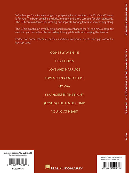 Whether you're a karaoke singer or preparing for an audition, the Pro Vocal series is for you. The book contains the lyrics, melody, and chord symbols for eight hit songs. The CD contains demos for listening and separate backing tracks so you can sing along. The CD is playable on any CD, but it is also enhanced for PC and Mac computer users so you can adjust the recording to any pitch without changing the tempo! Perfect for home rehearsal, parties, auditions, corporate events, and gigs without a backup band. This volume includes 8 more favorites, including: Come Fly with Me · High Hopes · Love and Marriage · Love's Been Good to Me · My Way · Strangers in the Night · (Love Is) the Tender Trap · Young at Heart.