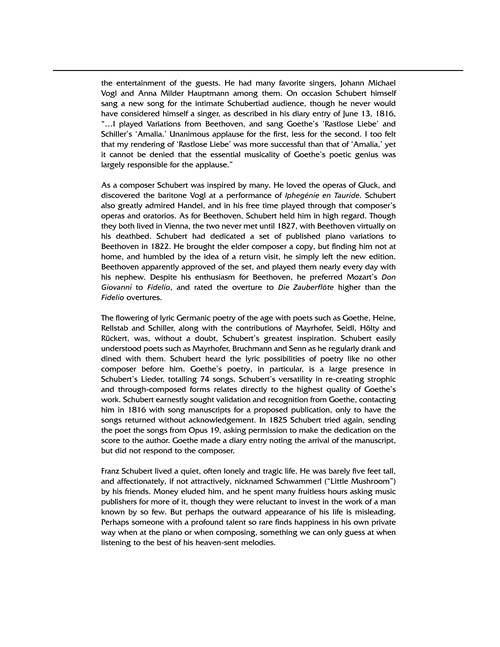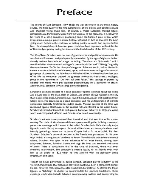 Contents: Abendstern · Abschied · Am Grabe Anselmos · Am See (Bruchmann) · Am See (Mayrhofer) · An den Mond (Goethe) · An den Mond (Hölty) · An den Tod · An die Entfernte · An die Geliebte · An die Laute · An die Leier · An die Musik · An die Nachtigall · An die Sonne · An Schwager Kronos · An Silvia · Auf dem Strom (high voice only) · Auf dem Wasser zu singen · Auf der Bruck · Das Abendrot (low voice only) · Dass sie hier gewesen! · Der Alpenjäger · Der Hirt auf dem Felsen (high voice only) · Der Jüngling an der Quelle · Der König in Thule · Der Musensohn · Der Neugierige · Der Tod und das Mädchen · Der Wanderer · Der Zwerg · Die Allmacht · Die böse Farbe · Die Forelle · Die junge Nonne · Die liebe Farbe · Die Liebe hat gelogen · Die Männer sind méchant! · Die Unterscheidung · Du bist die Ruh · Du liebst mich nicht · Ellens Gesang I (Raste Krieger) · Ellens Gesang II (Jäger, ruhe von der Jagd!) · Ellens Gesang III (Ave Maria!) · Erlafsee · Erlkönig · Erster Verlust · Frühlingsglaube · Ganymed · Geheimes · Grenzen der Menschheit · Gretchen am Spinnrade · Gruppe aus dem Tartarus · Heidenröslein · Heliopolis I · Heliopolis II · Herbst · Hoffnung · Im Abendrot · Im Frühling · Im Haine · Im Walde · Jägers Abendlied · Klaglied · Lachen und Weinen · Liebe schwärmt auf allen Wegen · Lied der Mignon (Hei mich nicht reden) · Lied der Mignon (So lasst mich scheinen) · Lied der Mignon (Nur wer die Sehnsucht kennt) · Litanei · Meeres Stille · Memnon · Mignons Gesang (Kennst du das Land) · Nacht und Träume · Nachtstück · Nachtviolen · Rastlose Liebe · Romanze (low voice only) · Schäfers Klagelied · Schwanengesang: Liebesbotschaft · Kriegers Ahnung · Frühlingssehnsucht · Ständchen · Aufenthalt · In der Ferne · Abschied (Rellstab) · Der Atlas · Ihr Bild · Das Fischermädchen · Die Stadt · Am Meer · Der Doppelgänger · Die Taubenpost · Sehsucht · Sei mir gegrüsst · Seligkeit · Ständchen · Suleika I · Verklärung · Wandrers Nachtleid I · Wandrers Nachtleid II · Wohin?