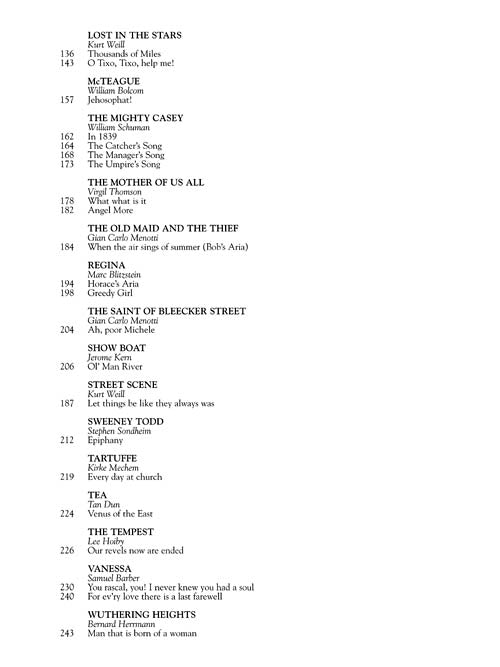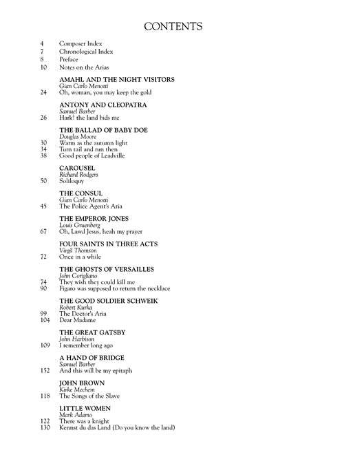This landmark series collects compelling, useful, singer-friendly excerpts from the best of a distinctly American musical tradition. Plot notes and basic information about each opera are included. Opera composers such as Samuel Barber, William Bolcom, Douglas Moore, Virgil Thomson and Kurt Weill are represented. The operas of Gian Carlo Menotti are particularly present, with 26 arias from nine operas in the series. Contents: AMAHL AND THE NIGHT VISITORS: Oh, woman, you may keep the gold · ANTONY AND CLEOPATRA: Hark! the land bids me · THE BALLAD OF BABY DOE: Warm as the autumn light, Turn tail and run then, Good people of Leadville · CAROUSEL: Soliloquy · THE CONSUL: The Police Agent's Aria · THE EMPEROR JONES: Oh Lawd Jesus, heah my prayer · FOUR SAINTS IN THREE ACTS: Once in a while · THE GHOSTS OF VERSAILLES: They wish they could kill me, Figaro was supposed to return the necklace · THE GOOD SOLDIER SCHWEIK: The Doctor's Aria, Dear Madame · THE GREAT GATSBY: I remember long ago · A HAND OF BRIDGE: And this will be my epitaph JOHN BROWN: The Songs of the Slave · LITTLE WOMEN: There was a knight, Kennst du das Land (Do you know the land) · LOST IN THE STARS: Thousands of Miles, O Tixo, Tixo, help me! · McTEAGUE: Jehosophat! · THE MIGHTY CASEY: In 1839, The Catcher's Song, The Manager's Song, The Umpire's Song · THE MOTHER OF US ALL: What what is it, Angel More · THE OLD MAID AND THE THIEF: When the air sings of summer (Bob's Aria) · REGINA: Horace's Aria, Greedy Girl · THE SAINT OF BLEECKER STREET: Ah, poor Michele · SHOW BOAT: Ol' Man River · STREET SCENE: Let things be like they always was · SWEENEY TODD: Epiphany · TARTUFFE: Every day at church · TEA: Venus of the East · THE TEMPEST: Our revels now are ended · VANESSA: You rascal, you! I never knew you had a soul, For ev'ry love there is a last farewell · WUTHERING HEIGHTS: Man that is born of a woman