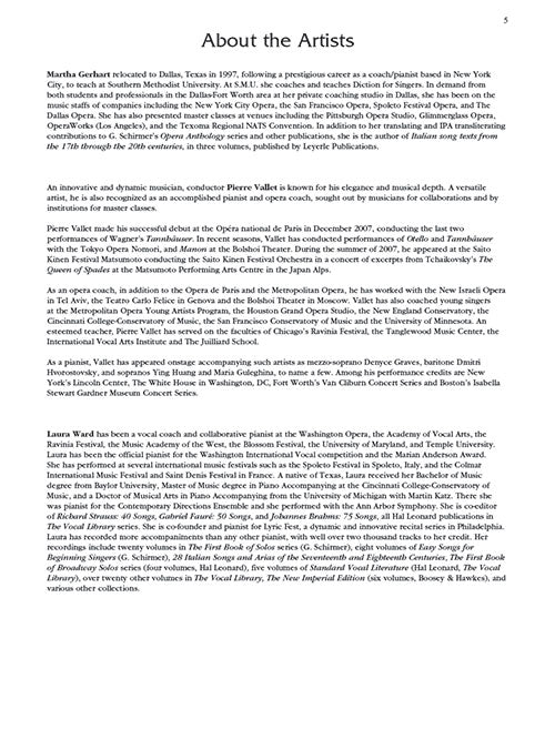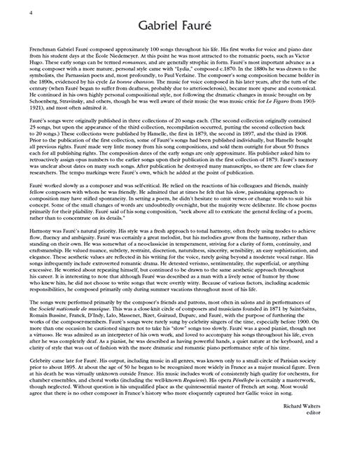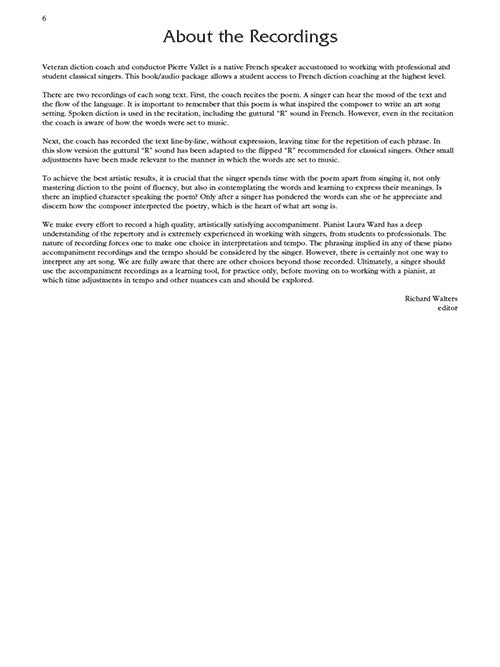 with online audio of diction lessons and piano accompaniments; includes historical notes, translations and International Phonetic Alphabet This is a collection of the most famous songs of Fauré. Diction lessons were recorded by coach, conductor and diction specialist Pierre Vallet. The diction for each song is recorded twice: first recited as an actor would speak it, showing flow of the language and mood, followed by a slow, deliberate lesson, allowing time for the student to repeat each line. This experienced language coach adapts the R in French in the slow versions as recommended for classical singers. He is also very senstive to liaisons between word sounds in musical settings. Contents: Après un rêve· Au bord de l'eau · Aurore · Automne · Chanson d'amour · Clair de lune · Ici-bas · Le Secret · Les berceaux · Les roses d'Ispahan · Lydia · Mandoline · Nell · Notre amour · Rencontre.