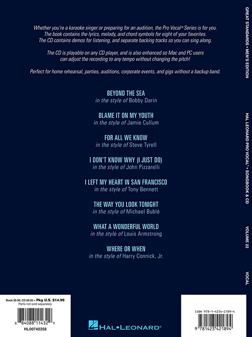 Whether you're a karaoke singer or preparing for an audition, the Pro Vocal series is for you. The book contains the lyrics, melody, and chord symbols for eight hit songs. The CD contains demos for listening and separate backing tracks so you can sing along. The CD is playable on any CD, but it is also enhanced for PC and Mac computer users so you can adjust the recording to any pitch without changing the tempo! Perfect for home rehearsal, parties, auditions, corporate events, and gigs without a backup band. This volume includes 8 songs: Beyond the Sea · Blame It on My Youth · For All We Know · I Don't Know Why (I Just Do) · I Left My Heart in San Francisco · The Way You Look Tonight · What a Wonderful World · Where or When.