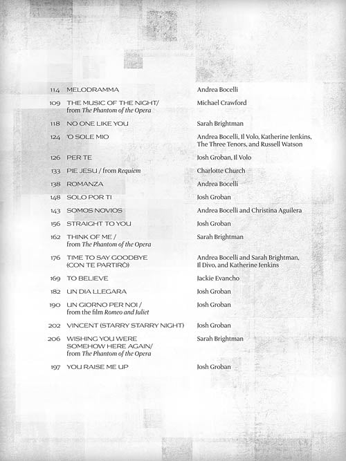 36 songs recorded by well-known artists, including: Andrea Bocelli, Josh Groban, Jackie Evancho, Sarah Brightman, Il Divo, Charlotte Church, Il Volo, and others.