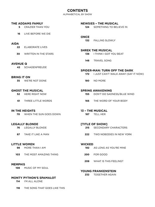 Duets for various combinations of voices from The Addams Family · Aida · Avenue Q · Bring It On · Ghost the Musical · In the Heights · Legally Blonde · The Lion King · Little Women · Memphis ·Monty Python's Spamalot · Newsies the Musical ·Once · Shrek the Musical · Spider Man: Turn Off the Dark · Spring Awakening · 13: The Musical · [title of show] · Young Frankenstein. Contents: As Long As You're Mine (from the Broadway Musical WICKED) * Crazier Than You (from THE ADDAMS FAMILY) * Don't Do Sadness/Blue Wind (from SPRING AWAKENING) * Elaborate Lives (from Elton John and Tim Rice's AIDA) * Falling Slowly (from the Motion Picture ONCE) * For Good (from the Broadway Musical WICKED) * Here Right Now (from GHOST THE MUSICAL) * I Just Can't Walk Away (Say It Now) (from SPIDER-MAN: TURN OFF THE DARK) * I Think I Got You Beat (from SHREK THE MUSICAL) * I'm All Alone (from MONTY PYTHON'S SPAMALOT) * Legally Blonde (from LEGALLY BLONDE) * Live Before We Die (from THE ADDAMS FAMILY) * More Than I Am (from the Stage Musical LITTLE WOMEN) * The Most Amazing Thing (from the Stage Musical LITTLE WOMEN) * Music Of My Soul (from MEMPHIS) * No More (from SPIDER-MAN: TURN OFF THE DARK) * Schadenfreude (from the Broadway Musical AVENUE Q) * Secondary Characters (from [title of show]) * Something To Believe In (from Disney's NEWSIES THE MUSICAL) * The Song That Goes Like This (from MONTY PYTHON'S SPAMALOT) * Take It Like A Man (from LEGALLY BLONDE) * Tell Her (from the Broadway Musical 13) * Three Little Words (from GHOST THE MUSICAL) * Together Again (from YOUNG FRANKENSTEIN) * Travel Song (from SHREK THE MUSICAL) * Two Nobodies In New York (from [title of show]) * We're Not Done (from BRING IT ON) * What Is This Feeling? (from the Broadway Musical WICKED) * When The Sun Goes Down (from IN THE HEIGHTS) * The Word Of Your Body (from SPRING AWAKENING) * Written In The Stars (from AIDA)
