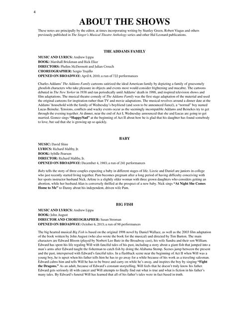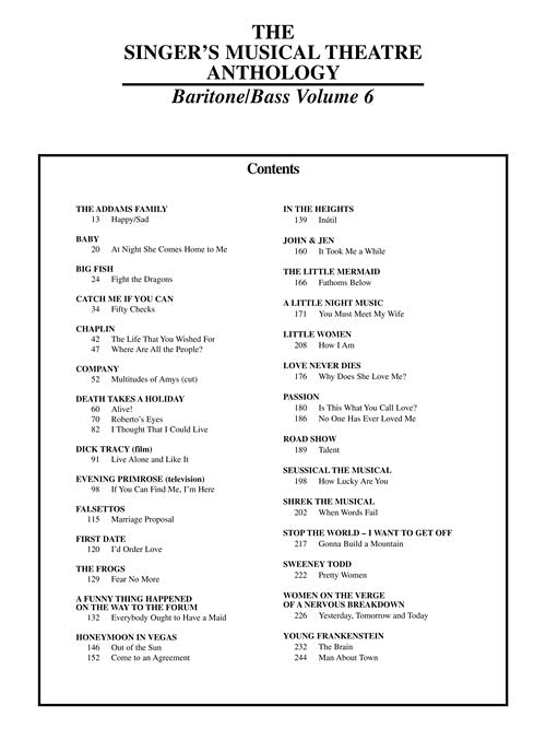 The world's most trusted source for great theatre literature for singing actors! Each song is in its original key and has been chosen particularly for each voice type. The selection of songs comes from classic through contemporary shows and the book includes notes about each show and song. Contents: THE ADDAMS FAMILY: Happy/Sad · BABY: At Night She Comes Home to Me · BIG FISH: Fight the Dragons · CATCH ME IF YOU CAN: Fifty Checks · CHAPLIN: The Life That You Wished For · Where Are All the People · COMPANY: Multitudes of Amys (cut) · DEATH TAKES A HOLIDAY: Alive! · Roberto's Eyes · I Thought That I Could Live · DICK TRACY (film): Live Alone and Like It · EVENING PRIMROSE: If You Can Find Me, I'm Here · FALSETTOS: Marriage Proposal · FIRST DATE: I'd Order Love · THE FROGS: Fear No More · A FUNNY THING HAPPENED ON THE WAY TO THE FORUM: Everybody Ought to Have a Maid · HONEYMOON IN VEGAS: Out of the Sun · Come to an Agreement · IN THE HEIGHTS: Inútil · JOHN & JEN: It Took Me a While · THE LITTLE MERMAID: Fathoms Below · A LITTLE NIGHT MUSIC: You Must Meet My Wife · LITTLE WOMEN: How I Am · LOVE NEVER DIES: Why Does She Love Me? · A NEW BRAIN: I'd Rather Be Sailing · PASSION: Is This What You Call Love? · No One Has Ever Loved Me · ROAD SHOW: Talen t· SEUSSICAL THE MUSICAL: How Lucky You Are · SHREK THE MUSICAL: When Words Fail · STOP THE WORLD - I WANT TO GET OFF: Gonna Build a Mountain · SWEENEY TODD: Pretty Women · WOMEN ON THE VERGE OF A NERVOUS BREAKDOWN: Yesterday, Tomorrow and Today · YOUNG FRANKENSTEIN: The Brain · Man About Town.