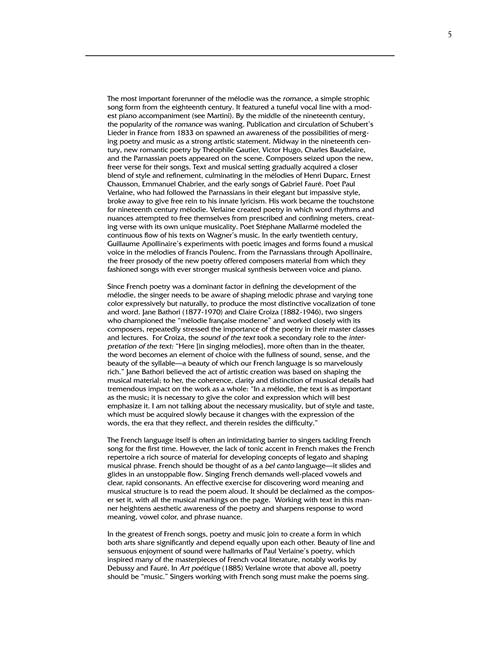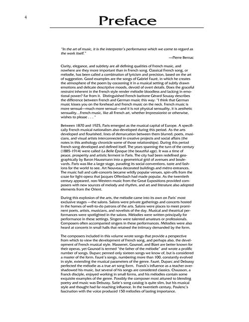The largest, most comprehensive collection of French art songs ever published, with 60 songs by 24 composers. This wonderful anthology, with newly researched editions in clean new engravings, includes interesting notes about the composers, poets, facts about the composition and performance history for each song, and new line-by-line translations for study. Contents: BERLIOZ: Villanelle · BIZET: Chanson d'avril · Guitare · Ouvre ton coeur · CHABRIER: Les cigales · Villanelle des petits canards · CHAUSSON: Hebe · Le charme · Le colibri · Le temps des lilas · DEBUSSY: Beau soir · Les cloches · Mandoline · Noel des enfants qui n'ont plus de maisons · DUBARC: Chanson triste · La vie anterieure · Lamento · FAURE: Apres un reve · Automne · Chanson d'amour · Clair de lune · Lydia · Mandoline · Notre amour · FRANCK: Nocturne · GOUNOD: L'absent · O ma belle rebelle · Venise · HAHN: A Chloris · Offrande · Si mes vers avaient des ailes · D'INDY: Madrigal · KOECHLIN: Si tu le veux · LISZT: Oh! quand je dors · MARTINI: Plaisir d'amour · MASSENET: Nuit d'Espagne · Si tu veux, Mignonne · MOZART: Dans un bois solitaire · PALADILHE: Psyche · POULENC: Le Bestiaire · RAVEL: Sainte · Cinq melodies populairs grecques · ROUSSEL: Le bachelier de Salamanque · Sarabande · SAINT-SAENS: Aimons-nous · L'attente · SATIE: Je te veux · La statue de bronze · SEVERAC: Les hiboux · Philis · VIARDOT: Fleur dessechee