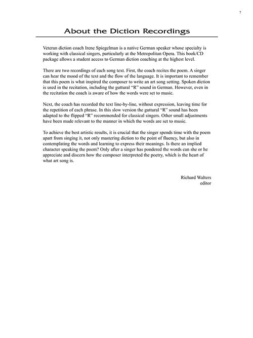 with IPA and word for word translations and CDs of recorded diction lessons This is a companion to The Lieder Anthology, edited by Virginia Saya and Richard Walters, with 65 songs by 13 composers. The diction lessons were recorded by Irene Spiegelman, German coach at the Metropolitan Opera. The diction for each song is recorded twice: first recited as an actor would speak it, showing flow of the language and the mood, followed by a slow, deliberate lesson, allowing time for the student to repeat each line. This experienced language coach adapts the R in German in the slow versions as recommended for classical singers. Contents: BEETHOVEN: Der Kuss · Ich liebe dich · Sehnsucht · BRAHMS: Dein blaues Auge · Die Mainacht · Immer leiser wird mein Schlummer · Meine Liebe ist grun · Sonntag · Sonntag · Standchen · Vergebliches Standchen · Wie Melodien zieht es mir · Ophelia Lieder · FRANZ: Aus meinen grossen Schmerzen · Er ist gekommen · Fur Musik · Im Herbst · MAHLER: Fruhlingsmorgen · Liebst du um Schonheit · Lob des hohen Verstandes · Wer hat dies Liedlein erdacht? · ALMA MAHLER: Laue Sommernacht · FANNY MENDELSSOHN: Italien · MENDELSSOHN: Der Blumenstrauss · Neue Liebe · MOZART: Abendempfindung · Als Luise die Briefe ihres ungetreuen Liebhabers verbrannte · Das Veilchen · SCHUBERT: An die Musik · Auf dem Wasser zu singen · Der Musensohn · Die Forelle · Du bist die Ruh · Gretchen am Spinnrade · Lachen und Weinen · Nacht und Traume · Rastlose Liebe · Standchen · CLARAL SCHUMANN: Liebst du um Schonheit · SCHUMANN: Der Nussbaum · Die Lotosblume · Du bist wie eine Blume · Du Ring an meinem Finger · Ich grolle nicht · In der Fremde · Intermezzo · Waldesgesprach · Widmung · RICHARD STRAUSS: Allerseelen · Breit' uber mein Haupt · Die Nacht · Du meines Herzens Kronelein · Ich trage meine Minne · Morgen! · Zueignung · WOLF: Anakreons Grab · Auch kleine Dinge · Auf ein altes Bild · Der Musikant · In dem Schatten meiner Locken · Lebe wohl · Verborgenheit