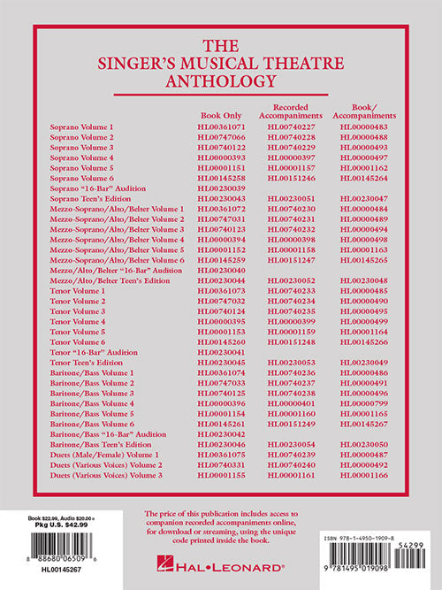 A collection of songs from the musical stage, categorized by voice type. The selections are presented in their authentic settings, excerpted from the original vocal scores. Contents: THE ADDAMS FAMILY: Happy/Sad · BABY: At Night She Comes Home to Me · BIG FISH: Fight the Dragons · CATCH ME IF YOU CAN: Fifty Checks · CHAPLIN: The Life That You Wished For · Where Are All the People · COMPANY: Multitudes of Amys (cut) · DEATH TAKES A HOLIDAY: Alive! · Roberto's Eyes · I Thought That I Could Live · DICK TRACY (film): Live Alone and Like It · EVENING PRIMROSE: If You Can Find Me, I'm Here · FALSETTOS: Marriage Proposal · FIRST DATE: I'd Order Love · THE FROGS: Fear No More · A FUNNY THING HAPPENED ON THE WAY TO THE FORUM: Everybody Ought to Have a Maid · HONEYMOON IN VEGAS: Out of the Sun · Come to an Agreement · IN THE HEIGHTS: Inútil · JOHN & JEN: It Took Me a While · THE LITTLE MERMAID: Fathoms Below · A LITTLE NIGHT MUSIC: You Must Meet My Wife · LITTLE WOMEN: How I Am · LOVE NEVER DIES: Why Does She Love Me? · A NEW BRAIN: I'd Rather Be Sailing · PASSION: Is This What You Call Love? · No One Has Ever Loved Me · ROAD SHOW: Talen t· SEUSSICAL THE MUSICAL: How Lucky You Are · SHREK THE MUSICAL: When Words Fail · STOP THE WORLD - I WANT TO GET OFF: Gonna Build a Mountain · SWEENEY TODD: Pretty Women · WOMEN ON THE VERGE OF A NERVOUS BREAKDOWN: Yesterday, Tomorrow and Today · YOUNG FRANKENSTEIN: The Brain · Man About Town.