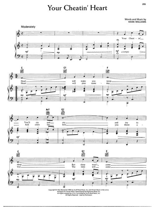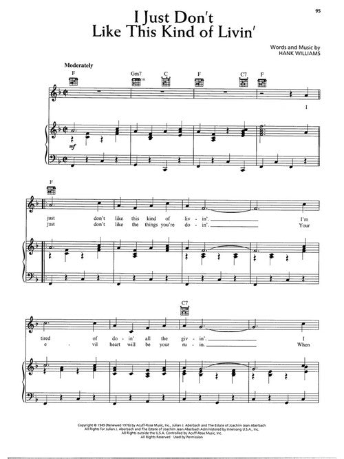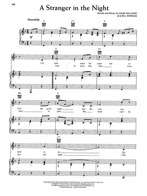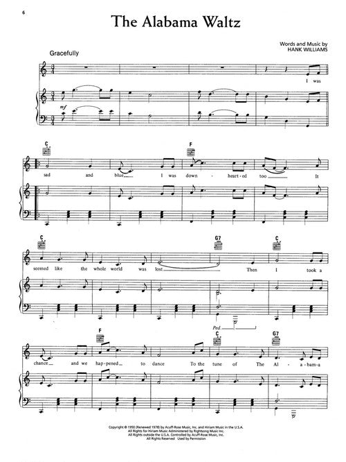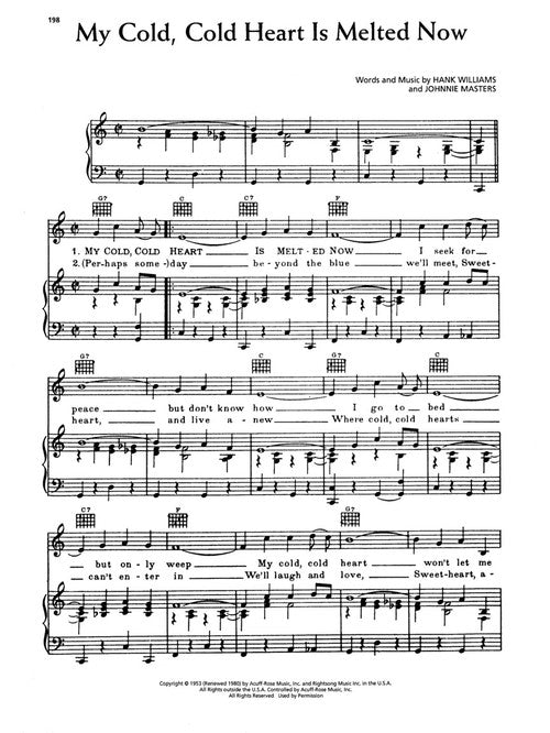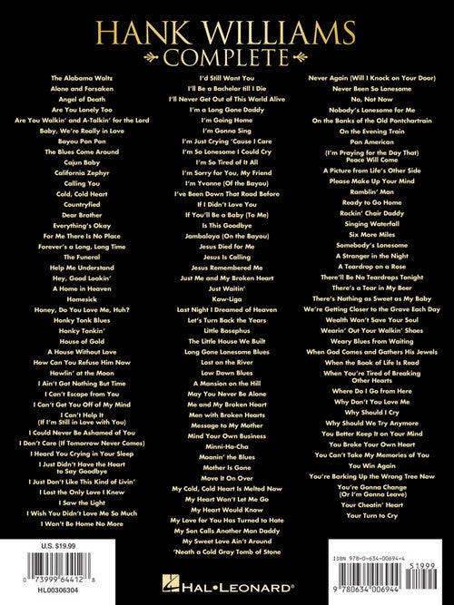 This comprehensive compilation contains every song written by country music legend Hank Williams. Includes 128 in all: Cold, Cold Heart · Hey, Good Lookin' · Honky Tonkin' · I Ain't Got Nothing but Time · I Can't Help It (If I'm Still in Love with You) · I Saw the Light · I'm a Long Gone Daddy · I'm So Lonesome I Could Cry · Jambalaya (On the Bayou) · Jesus Is Calling · A Mansion on the Hill · My Son Calls Another Man Daddy · There's a Tear in My Beer · Your Cheatin' Heart · many more! Also includes a biography.