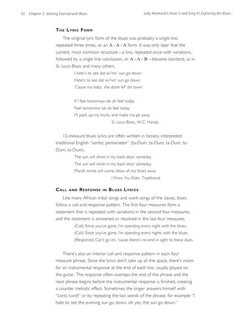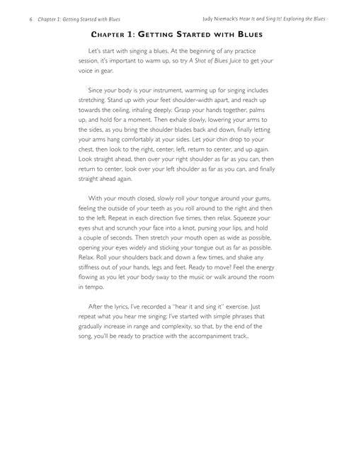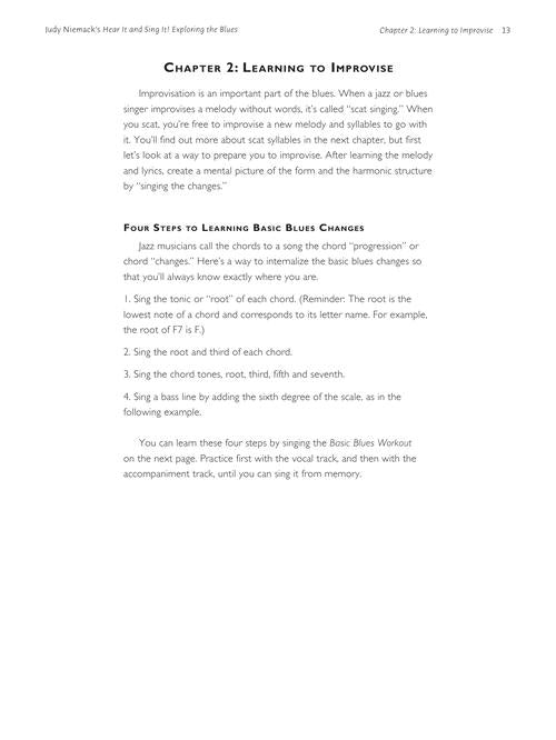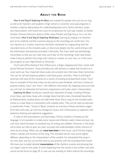 Hear It and Sing It! Exploring the Blues is an effective tool for learning to sing and improvise on blues. Designed for people who love to sing, as well as for students and teachers in vocal jazz programs, it includes a step-by-step approach to learning blues lyrics, forms, harmony, scales and improvisation, with a brand new repertoire of songs. Vocal examples followed by accompaniment-only tracks make learning easy and enjoyable. New songs include lyrics added to compositions by jazz greats Dexter Gordon (plus lyrics to his solo), Johnny Griffin, Gigi Gryce, Julian Priester and Norman Simmons as well as compositions by Judy Niemack and Sheila Jordan. The book includes: blues forms, scales and harmony; transcriptions of exercises and improvised solos; accurate lead sheets for 14 contemporary blues songs; examples of 12 different blues forms; scat syllables; blues riffs; Voices in Blues history chapter; Listening and repertoire suggestions; and access to online audio. The Online Audio include: 14 songs and exercises sung by Judy Niemack, Sheila Jordan, Mark Murphy and Darmon Meader; Hear It and Sing It blues warm-ups, riffs, scales and harmony; recordings of each song featuring vocal plus accompaniment-only; exciting accompaniment tracks by top New York City jazz musicians; and more.