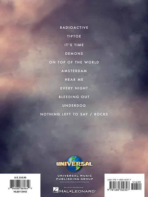 The 2012 debut album by these Las Vegas indie rockers peaked atop the Billboard Alternative Albums chart and was named one of that magazine's 125 Essential Fall Albums. Here are P/V/G arrangements of all the tracks: Amsterdam · Bleeding Out · Demons · Every Night · Hear Me · It's Time · Nothing Left to Say / Rocks · On Top of the World · Radioactive · Tiptoe · Underdog.