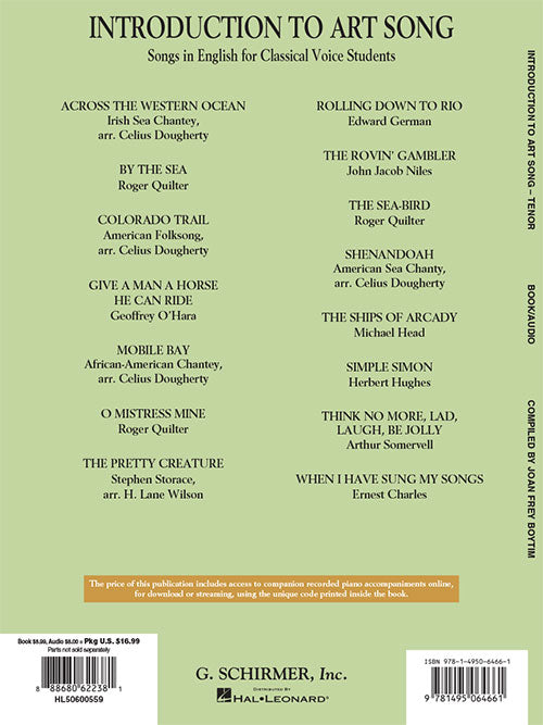 Joan Boytim has selected some of the easiest songs in English from The First Book of Solos series and transposed them for a different voice type, making the songs available to more students. Additionally, other suitable American and British art songs have been included. With 15-20 songs per volume, each voice type has a unique song list. Perfect for voice class, as well as private lessons. Contents for the tenor volume include: ACROSS THE WESTERN OCEAN (Irish Sea Chantey, arr. Celius Dougherty) · BY THE SEA (Roger Quilter) · COLORADO TRAIL (American Folksong, arr. Celius Dougherty) · GIVE A MAN A HORSE HE CAN RIDE (Geoffrey O'Hara) · MOBILE BAY (African-American Chantey, arr. Celius Dougherty) · O MISTRESS MINE (Roger Quilter) · THE PRETTY CREATURE (Stephen Storace, arr. H. Lane Wilson) · ROLLING DOWN TO RIO (Edward German) · THE ROVIN' GAMBLER (John Jacob Niles) · THE SEA-BIRD (Roger Quilter) · SHENANDOAH (American Sea Chanty, arr. Celius Dougherty) · THE SHIPS OF ARCADY (Michael Head) · SIMPLE SIMON (Herbert Hughes) · THINK NO MORE, LAD, LAUGH, BE JOLLY (Arthur Somervell) · WHEN I HAVE SUNG MY SONGS (Ernest Charles) During the past 25 years, I have used the majority of Boytim's anthologies. I find these most recent publications to be the most useful of all. A student could use their voice type's volume for many years, eventually singing every song in it. They will be a staple in my studio in the future.-American Music Teacher