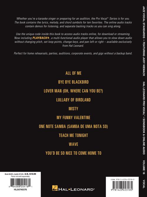 Whether you're a karaoke singer or preparing for an audition, the Pro Vocal series is for you. The book contains the lyrics, melody, and chord symbols for eight classic songs. The audio contains demos for listening and separate backing tracks so you can sing along. Perfect for home rehearsal, parties, auditions, corporate events, and gigs without a backup band. This volume features 10 popular jazz standards, including: All of Me · Bye Bye Blackbird · Lover Man (Oh, Where Can You Be?) · Lullaby of Birdland · Misty · My Funny Valentine · One Note Samba (Samba De Uma Nota So) · Teach Me Tonight · Wave · You'd Be So Nice to Come Home To. Audio is accessed online using the unique code inside the book and can be streamed or downloaded. The audio files include PLAYBACK+, a multi-functional audio player that allows you to slow down audio without changing pitch, set loop points, change keys, and pan left or right.