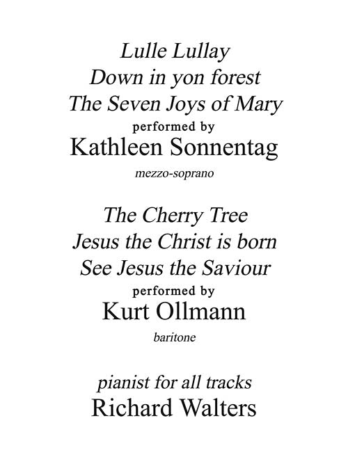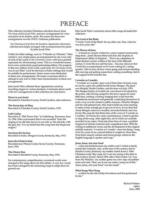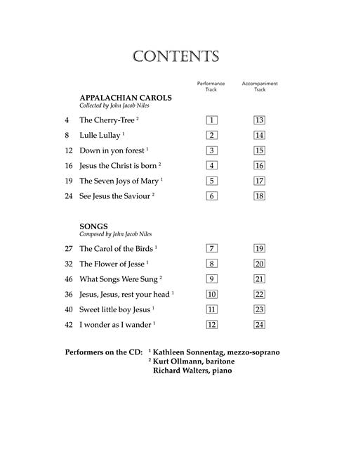 This collection includes new arrangements for voice and piano of six songs originally published in Ten Christmas Carols from the Southern Appalachian Mountains, collected by John Jacob Niles, as well as familiar classics composed by Niles. The recorded performances will help all become familiar with these new settings. All selections are appropriate for student singers as well as more experienced singers for use in Christmas services. Contents: The Carol of the Birds · The Cherry Tree · Down in yon forest · The Flower of Jesse · I wonder as I wander · Jesus, Jesus, rest your head · Jesus the Christ, is born · Lulle Lullay · See Jesus, the Saviour · The Seven Joys of Mary · Sweet little boy Jesus · What Songs Were Sung.