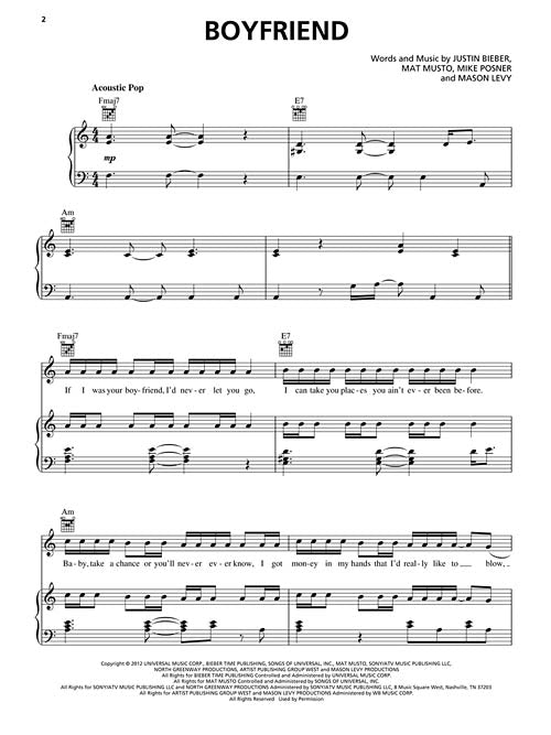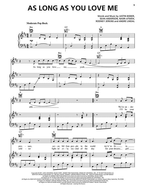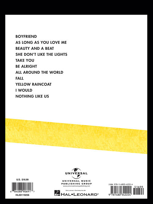 Our matching folio features acoustic and live versions of songs from Justin's blockbuster Believe, as well as three new recordings! Titles: All Around the World · As Long as You Love Me · Be Alright · Beauty and a Beat · Boyfriend · Fall · I Would · Nothing like Us · She Don't Like the Lights · Take You · Yellow Raincoat.