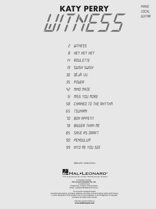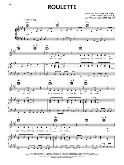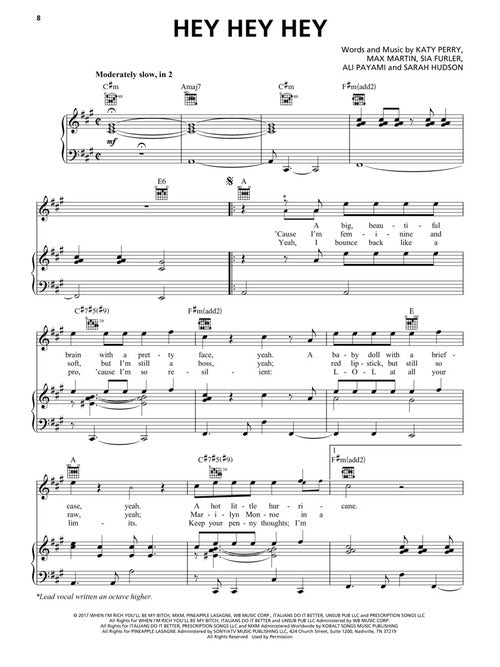 Katy Perry's 2017 album release has reached the top of the Billboard® 200 album charts, led by the single Chained to the Rhythm. Our folio for piano, voice and guitar includes this song and 14 others: Bigger Than Me · Bon Appetit · Deja Vu · Hey Hey Hey · Into Me You See · Mind Maze · Miss You More · Pendulum · Power · Roulette · Save As Draft · Swish Swish · Tsunami · Witness.