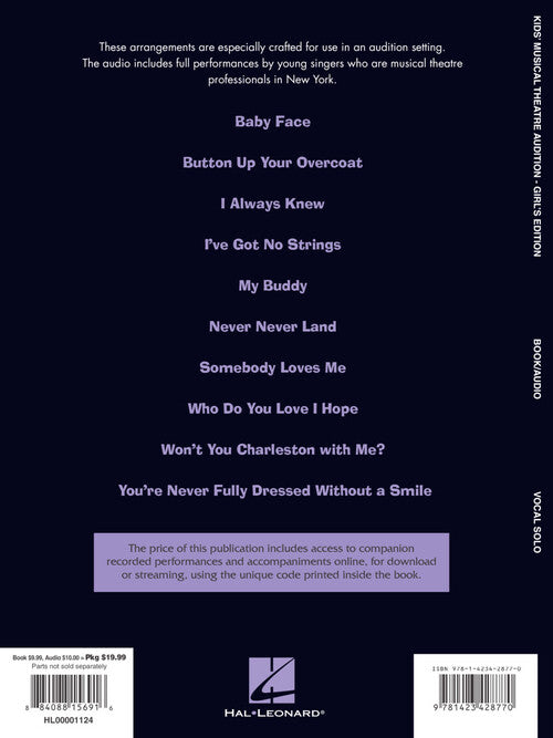 These are proven audition songs, chosen and arranged especially for children by Broadway veteran coach Michael Dansicker. The recordings are of top working professionals on Broadway. Girl's Edition Contents: Baby Face · Button Up Your Overcoat · I Always Knew · I've Got No Strings · My Buddy · Never Never Land · Somebody Loves Me · Who Do You Love I Hope · Won't You Charleston With Me · You're Never Fully Dressed Without a Smile. Audio is accessed online using the unique code inside the book and can be streamed or downloaded. The audio files include PLAYBACK+, a multi-functional audio player that allows you to slow down audio without changing pitch, set loop points, change keys, and pan left or right.