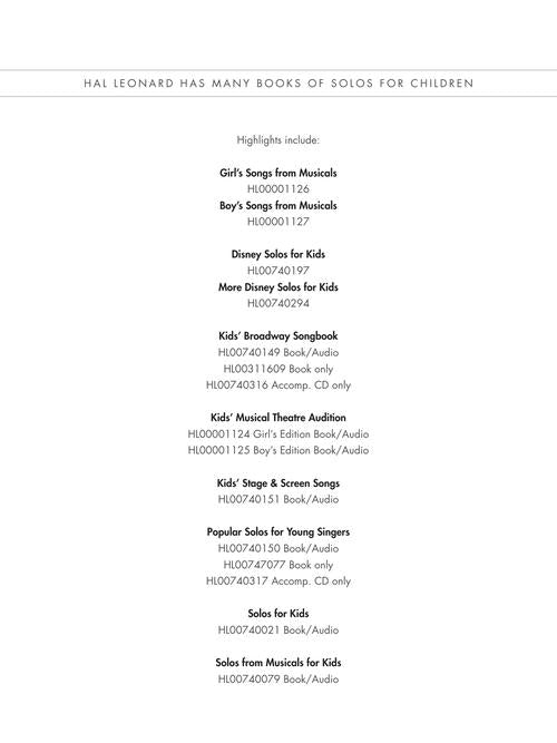 This giant two-volume resource will be indispensible for teachers working with children singing solos. There is a large variety of material, from classic Disney songs to Broadway to movie favorites to songs from Sesame Street. Each volume has songs for both girls and boys. Volume 1 includes 29 songs from stage, screen and television musicals, these are by far our largest collections of solos for children. Includes access to companion recorded accompaniments available online for download or streaming. Contents: Any Dream Will Do (Joseph and the Amazing Technicolor Dreamcoat) Born to Entertain (Ruthless) The Candy Man (Willie Wonka and the Chocolate Factory) Castle on a Cloud (Les Misérables) Consider Yourself (Oliver!) Cruella De Vil (101 Dalmatians) Ev'rybody Wants to Be a Cat (The Aristocats) Feed the Birds (Mary Poppins) Happiness (You're a Good Man Charlie Brown) I Don't Need Anything but You (Oliver!) I Got the Sun in the Morning (Annie Get Your Gun) I Know Things Now (Into the Woods) I Whistle a Happy Tune (The King and I) I'd Do Anything (Oliver) It's the Hard-Knock Life (Annie) Les Poissons (The Little Mermaid) Let Me Entertain You (Gypsy) Let's Go Fly a Kite (Mary Poppins) Little Lamb (Gypsy) Maybe (Annie) My Favorite Things (The Sound of Music) On the Good Ship Lollipop (Bright Eyes) Part of Your World (The Little Mermaid) Reflection (Mulan) So This Is Love (The Cinderella Waltz) (Cinderella) Tomorrow (Annie) We're All in This Together (High School Musical) When You Wish Upon a Star (Pinocchio) The Work Song (Cinderella)