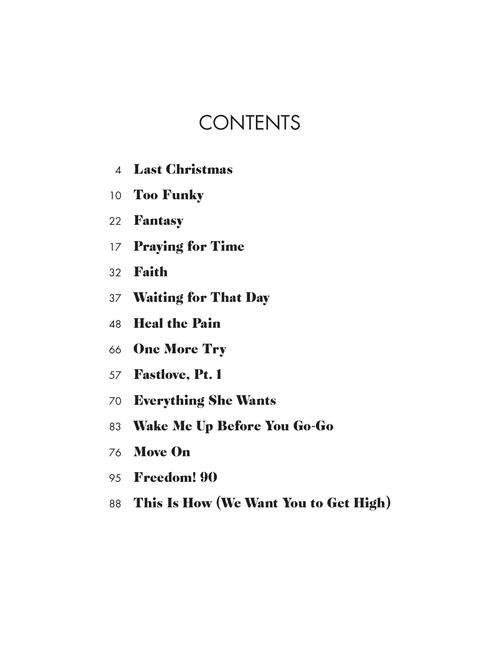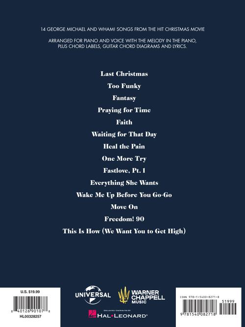 This songbook features 14 George Michael and Wham! tracks that made up the soundtrack to the 2019 romantic comedy. Each song is arranged for piano and voice with the melody in the piano, plus chord labels, guitar chord diagrams and lyrics. Songs include: Everything She Wants · Faith · Fantasy · Fastlove · Freedom '90 · Heal the Pain · Last Christmas · Move On · One More Try · Praying for Time · This Is How (We Want You to Get High) · Too Funky · Waiting for That Day · Wake Me Up Before You Go-Go.