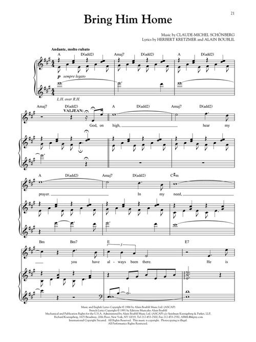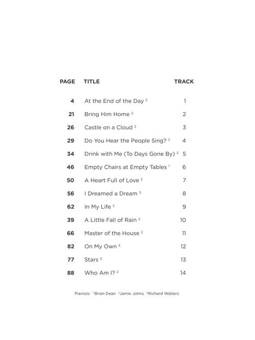 Songs in Broadway Singer's Editions include the vocal line and lyrics paired with faithful reductions of the orchestral accompaniments. The songs are all presented in their original keys, with the piano accompaniments carefully crafted for playability. The accompanying audio is accessed through Hal Leonard's popular MyLibrary system using the provided code. The audio can be streamed or downloaded and includes PLAYBACK+, a multi-functional audio player that allows you to slow down audio without changing pitch, set loop points, change keys, and pan left or right. Features: At the End of the Day · Bring Him Home · Castle on a Cloud · Do You Hear the People Sing? · Drink with Me (To Days Gone By) · Empty Chairs at Empty Tables · A Heart Full of Love · I Dreamed a Dream · In My Life · A Little Fall of Rain · Master of the House · On My Own · Stars · Who Am I?