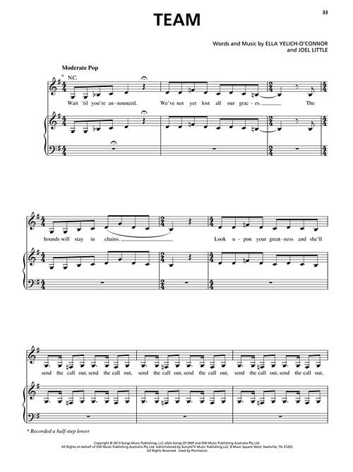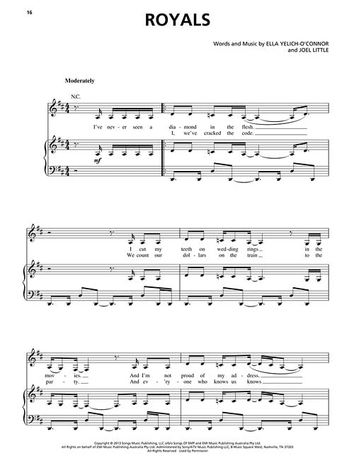 17-year-old New Zealand newcomer Lorde released this, her debut album, in September 2013. It reached the top of the modern rock/alternative and rock albums charts, and the lead single Royals won the 2014 Grammy® Award for Song of the Year and Best Pop Solo Performance. Our folio features this break-out hit plus nine other tunes: Buzzcut Season · 400 Lux · Ribs · Still Sane · Team · Tennis Court · and more.