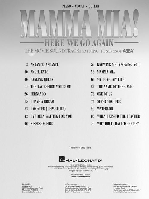 This 2018 sequel/prequel to the popular 2008 film of the same name again features the music of '70s pop sensation ABBA. Our matching songbook includes the songs: Andante, Andante · Angel Eyes · Dancing Queen · Day Before You Came · Fernando · I Have a Dream · I Wonder (Departure) · I've Been Waiting for You · Kisses of Fire · Knowing Me, Knowing You · Mamma Mia · My Love My Life · The Name of the Game · One of Us · Super Trouper · Waterloo · When I Kissed the Teacher · Why Did It Have to Be Me?