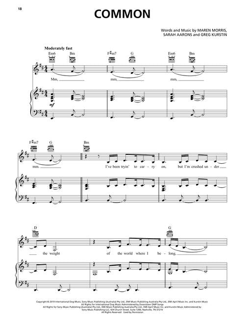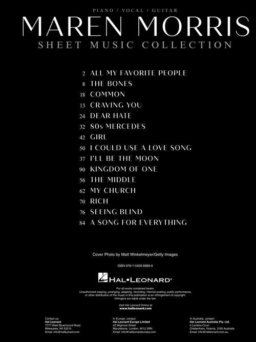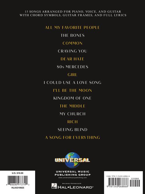 15 songs from the 2021 ACM Award winner for Female Artist of the Year. Our collection features 15 arrangements for piano, voice, and guitar with chord symbols, guitar frames, and full lyrics from her first two albums and her collaborations with Niall Horan, Dierks Bentley, Zedd, and others! Includes: The Bones · Craving You · Dear Hate · 80s Mercedes · Girl · I Could Use a Love Song · The Middle · My Church · Rich · A Song for Everything · and more.