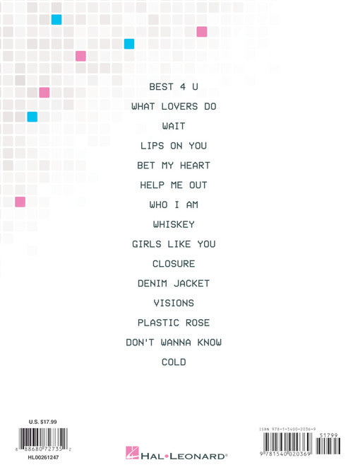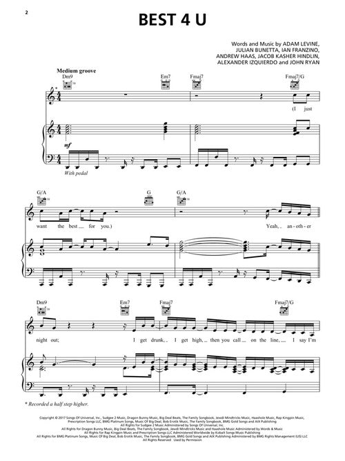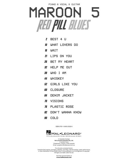 Maroon 5 keeps churning out the hits with their sixth studio album, this 2017 release led by the single What Lovers Do featuring Sza. Our songbooks features piano/vocal/guitar arrangements of this song and 14 more: Best 4 U · Bet My Heart · Closure · Cold · Denim Jacket · Don't Wanna Know · Girls like You · Help Me Out · Lips on You · Plastic Rose · Visions · Wait · Whiskey · Who I Am.