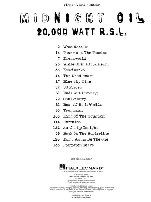 The 18 songs on this 1997 greatest hits album features songs that span 20 years of this hard-driving Australian rock band's career. Includes piano/vocal/guitar arrangements of: Beds Are Burning · Blue Sky Mine · The Dead Heart · Don't Wanna Be the One · Forgotten Years · One Country · Power and the Passion · Truganini · and more.
