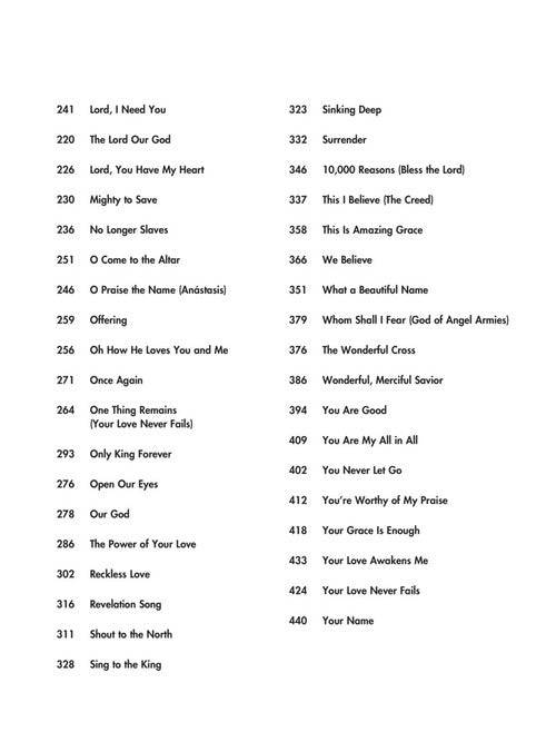 75 more contemporary worship favorites are contained in this updated second edition, including: Amazing Grace (My Chains Are Gone) · Blessed Be Your Name · Cornerstone · Everlasting God · Glorious Day · How Great Is Our God · In Christ Alone · Jesus Messiah · The Lion and the Lamb · Mighty to Save · O Come to the Altar · Reckless Love · Surrender · 10,000 Reasons (Bless the Lord) · What a Beautiful Name · Your Grace Is Enough · and more.