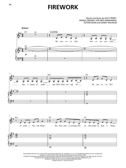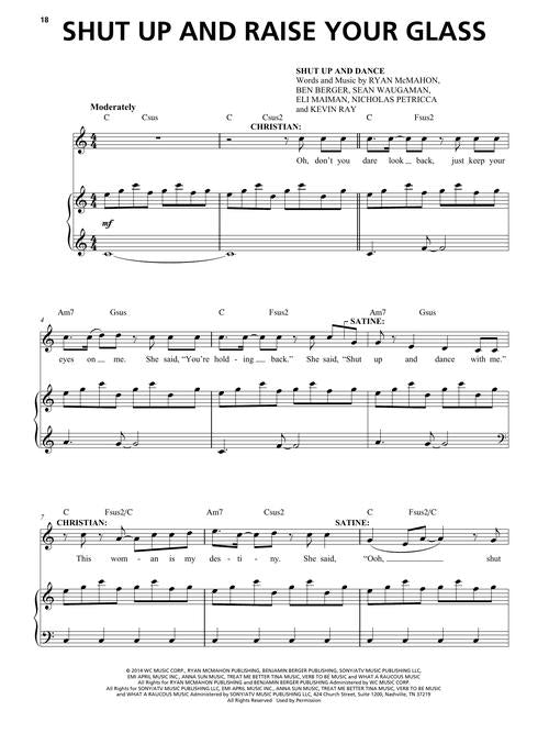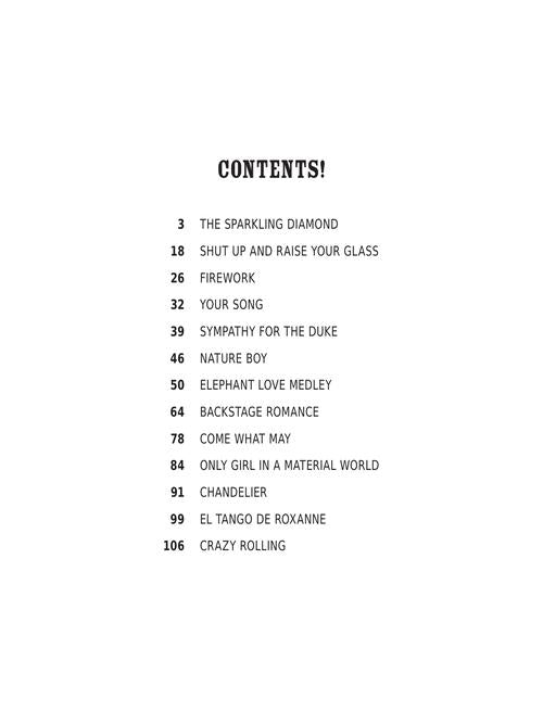 Baz Luhrmann's revolutionary film comes to life in the Broadway musical, Moulin Rouge. Our matching folio includes 13 songs arranged with vocal line and piano accompaniment: Backstage Romance · Chandelier · Come What May · Crazy Rolling · Elephant Love Medley · Firework · Nature Boy · Only Girl in a Material World · Shut Up and Raise Your Glass · The Sparkling Diamond · Sympathy for the Duke · El Tango de Roxanne · Your Song.