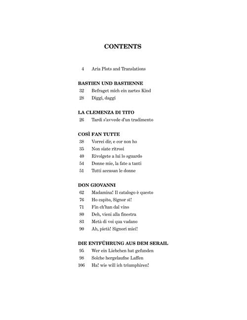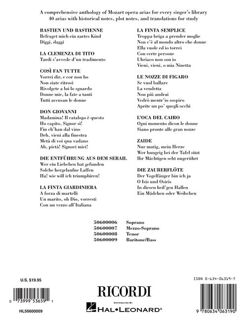 An essential new edition for every singer and voice studio! This is the most comprehensive multi-volume collection of Mozart opera arias ever published, with 31 to 41 arias per volume. Includes historical and plot notes about each opera and aria, and English translations for study. Contents: BASTIEN UND BASTIENNE: Befraget mich ein zartes Kind, Diggi, daggi · LA CLEMENZA DI TITO: Tardi s'avvede d'un tradimento · COSI FAN TUTTE: Vorrei dir, e cor non ho, Non siate ritrosi, Rivolgete a lui lo sguardo, Donne mie, lafate a tanti, Tutti accusan le donne · DON GIOVANNI: Madamina! Il catalogo e questo, Ho capito, Signor si! Fin ch'han dal vino, Deh, vieni alla finestra, Meta di voi qua vadano, Ah, pieta! Signori miei! · DIE ENTFUHRUNG AUS DEM SERAIL: Wer ein Liebchen hat gefunden, Solche hergelaufne Laffen, Ha! wie will ich triumphiren! · LA FINTA GIARDINIERA: A forza di martelli, Un marito, oh Dio, vorresti, Con un vezzo all'Italiana · LA FINTA SEMPLICE: Troppa briga a prender moglie, Non c'e al mondo altro che donne, Ella vuole ed io torrei, Con certe persone, Ubriaco non son io, Vieni, vieni, o mia Ninetta · LE NOZZE DI FIGARO: Se vuol ballare, La vendetta, Non piu andrai, Vedro mentr'io sospiro, Aprite un po' quegli occhi · L'OCA DEL CAIRO: Ogni momento dicon le donne, Siano pronte all gran nozze · ZAIDE: Nur mutig, mein Herze, Wer hungrig bei der Tafel sitzt, Ihr Machtigen seht ungeruhrt · DIE ZAUBERFLOTE: Der Vogelfanger bin ich ja, O Isis und Osiris, In diesen hel'gen Hallen, Ein Madchen oder Weibchen