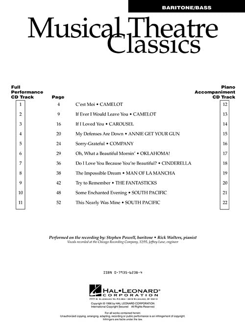 A fantastic series featuring the best songs from Broadway classics. Collections are organized by voice type and each book includes recorded piano accompaniment online. 11 songs, including: If Ever I Would Leave You · Some Enchanted Evening · C'est Moi · Sorry-Grateful · This Nearly Was Mine. Book includes access to online audio recordings of piano accompaniments.