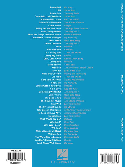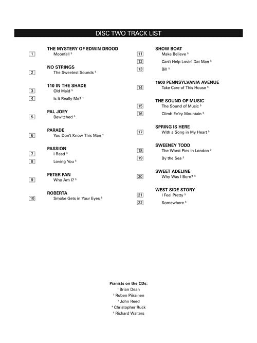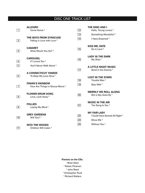 Contents: Bewitched (from PAL JOEY) · Bill (from SHOW BOAT) · By The Sea (from SWEENEY TODD) · Can't Help Lovin' Dat Man (from SHOW BOAT) · Children Will Listen (from INTO THE WOODS) · Climb Ev'ry Mountain (from THE SOUND OF MUSIC) · Come Home (from ALLEGRO) · Falling In Love With Love (from THE BOYS FROM SYRACUSE) · Hello, Young Lovers (from THE KING AND I) · How Are Things In Glocca Morra (from FINIAN'S RAINBOW) · I Could Have Danced All Night (from MY FAIR LADY) · I Feel Pretty (from WEST SIDE STORY) · I Have Dreamed (from THE KING AND I) · I Read (from PASSION) · If I Loved You (from CAROUSEL) · Is It Really Me? (from 110 IN THE SHADE) · Losing My Mind (from FOLLIES) · Love, Look Away (from FLOWER DRUM SONG) · Loving You (from PASSION) · Make Believe (from SHOW BOAT) · Moonfall (from THE MYSTERY OF EDWIN DROOD) · My Ship (from the Musical Production LADY IN THE DARK) · Not A Day Goes By (from MERRILY WE ROLL ALONG) · Old Maid (from 110 IN THE SHADE) · Send In The Clowns (from the Musical A LITTLE NIGHT MUSIC) · Show Me (from MY FAIR LADY) · Smoke Gets In Your Eyes (from ROBERTA) · So In Love (from KISS ME, KATE) · Something Wonderful (from THE KING AND I) · Somewhere (from WEST SIDE STORY) · The Song Is You (from MUSIC IN THE AIR) · The Sound Of Music (from THE SOUND OF MUSIC) · Stay Well (from the Musical Production LOST IN THE STARS) · The Sweetest Sounds (from NO STRINGS) · Take Care Of This House (from 1600 PENNSYLVANIA AVENUE) · To Keep My Love Alive (from A CONNECTICUT YANKEE) · Trouble Man (from the Musical Production LOST IN THE STARS) · What Would You Do? (from the Musical CABARET) · Who Am I? (from PETER PAN) · Why Was I Born? (from SWEET ADELINE) · Will You? (from GREY GARDENS) · With A Song In My Heart (from SPRING IS HERE) · Without You (from MY FAIR LADY) · The Worst Pies In London (from SWEENEY TODD) · You Don't Know This Man (from PARADE) · You'll Never Walk Alone (from CAROUSEL)