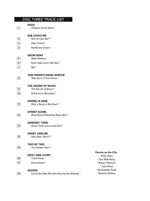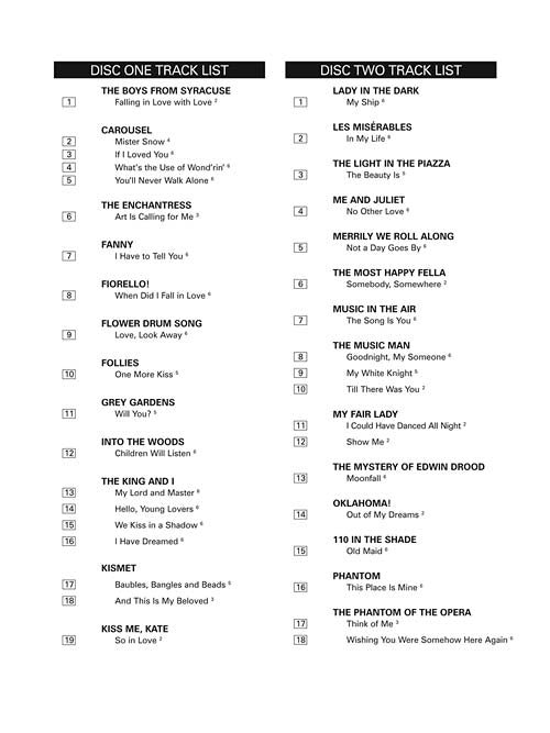 These CDs feature piano accompaniments to all the songs included in the corresponding songbook. Contents: And This Is My Beloved (from KISMET) · Art Is Calling For Me (from THE ENCHANTRESS) · Baubles, Bangles And Beads (from KISMET) · The Beauty Is (from THE LIGHT IN THE PIAZZA) · Bill (from SHOW BOAT) · Can't Help Lovin' Dat Man (from SHOW BOAT) · Children Of The Wind (from RAGS) · Children Will Listen (from INTO THE WOODS) · Climb Ev'ry Mountain (from THE SOUND OF MUSIC) · Dear Friend (from SHE LOVES ME) · Falling In Love With Love (from THE BOYS FROM SYRACUSE) · The Golden Ram (from TWO BY TWO) · Goodnight, My Someone (from Meredith Willson's THE MUSIC MAN) · Green Finch And Linnet Bird (from SWEENEY TODD) · Hello, Young Lovers (from THE KING AND I) · I Could Have Danced All Night (from MY FAIR LADY) · I Feel Pretty (from WEST SIDE STORY) · I Have Dreamed (from THE KING AND I) · I Have To Tell You (from FANNY) · If I Loved You (from CAROUSEL) · In My Life (from LES MISERABLES) · Let Us Be Glad (from the Broadway Musical WICKED) · Love, Look Away (from FLOWER DRUM SONG) · Make Believe (from SHOW BOAT) · Mister Snow (from CAROUSEL) · Moonfall (from THE MYSTERY OF EDWIN DROOD) · My Lord And Master (from THE KING AND I) · My Ship (from the Musical Production LADY IN THE DARK) · My White Knight (from Meredith Willson's THE MUSIC MAN) · No Other Love (from ME AND JULIET) · Not A Day Goes By (from MERRILY WE ROLL ALONG) · Old Maid (from 110 IN THE SHADE) · One More Kiss (from FOLLIES) · Out Of My Dreams (from OKLAHOMA!) · Show Me (from MY FAIR LADY) · So In Love (from KISS ME, KATE) · Somebody, Somewhere (from THE MOST HAPPY FELLA) · Somewhere (from WEST SIDE STORY) · The Song Is You (from MUSIC IN THE AIR) · The Sound Of Music (from THE SOUND OF MUSIC) · Take Care Of This House (from 1600 PENNSYLVANIA AVENUE) · Think Of Me (from THE PHANTOM OF THE OPERA) · This Place Is Mine (from PHANTOM) · Till There Was You (from Meredith Willson's THE MUSIC MAN) · Vanilla Ice Cream (from SHE LOVES ME) · We Kiss In A Shadow (from THE KING AND I) · What Good Would The Moon Be? (from the Musical Production STREET SCENE) · What's The Use Of Wond'rin' (from CAROUSEL) · When Did I Fall In Love (from the Musical FIORELLO!) · Why Was I Born? (from SWEET ADELINE) · Will He Like Me? (from SHE LOVES ME) · Will You? (from GREY GARDENS) · Wishing You Were Somehow Here Again (from THE PHANTOM OF THE OPERA) · With A Song In My Heart (from SPRING IS HERE) · You'll Never Walk Alone (from CAROUSEL)