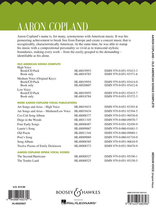 The two sets of Old American Songs are beloved, standard vocal literature. This edition combines the original Medium Voice sets in one publication. Transposed editions also available: (48018783 High Voice, $14.99 48018784 Low Voice, $14.99) Contents: At the River · Ching-a-ring Chaw · I Bought Me a Cat · Long Time Ago · Simple Gifts · The Boatmen's Dance · The Dodger · The Golden Willow Tree · The Little Horses · Zion's Walls