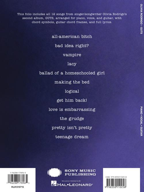 If you're one of the people who have listened to Olivia's sophomore release so often that it put all 12 songs onto the Billboard Hot 1 charts, chances are you will want this songbook so that you can play all the tracks yourself! Our matching folio includes all twelve songs arranged for piano and voice with guitar chord frames. Titles include: All-American Bitch · Bad Idea Right? · Ballad of a Homeschooled Girl · Get Him Back! · The Grudge · Lacy · Logical · Love Is Embarrassing · Making the Bed · Pretty Isn't Pretty · Teenage Dream · Vampire.