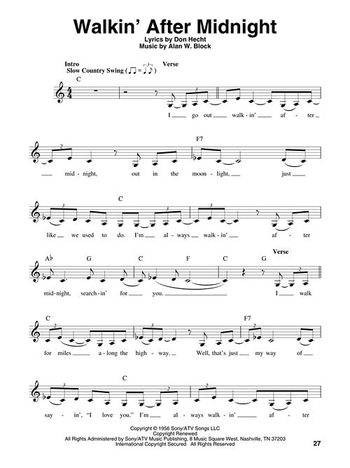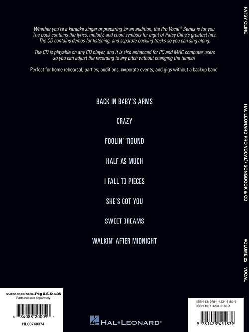 Whether you're a karaoke singer or preparing for an audition, the Pro Vocal series is for you. The book contains the lyrics, melody, and chord symbols for eight classic songs. The CD contains demos for listening and separate backing tracks so you can sing along. The CD is playable on any CD, but it is also enhanced for PC and Mac computer users so you can adjust the recording to any pitch without changing the tempo! Perfect for home rehearsal, parties, auditions, corporate events, and gigs without a backup band. This volume includes: Back in Baby's Arms · Crazy · Foolin' 'Round · Half as Much · I Fall to Pieces · She's Got You · Sweet Dreams · Walkin' After Midnight.