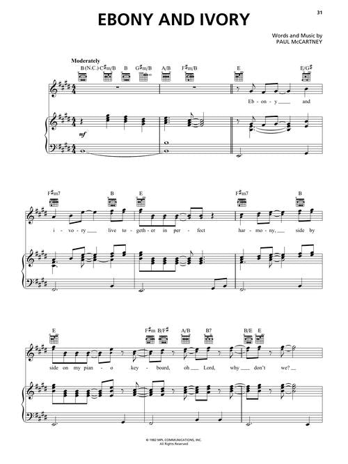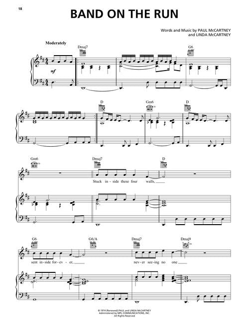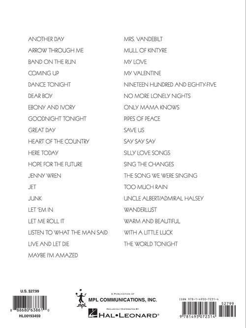 This fourth compilation album from Sir Paul features nearly 40 songs from throughout the icon's unrivaled career, and our matching songbook features all of them in arrangements for piano, voice and guitar. Songs include: Another Day · Band on the Run · Dance Tonight · Ebony and Ivory · Goodnight Tonight · Jet · Let 'Em In · Let Me Roll It · Listen to What the Man Said · Live and Let Die · Maybe I'm Amazed · Mull of Kintyre · My Love · No More Lonely Nights · Say Say Say · Silly Love Songs · Uncle Albert/Admiral Halsey · With a Little Luck · and many more.