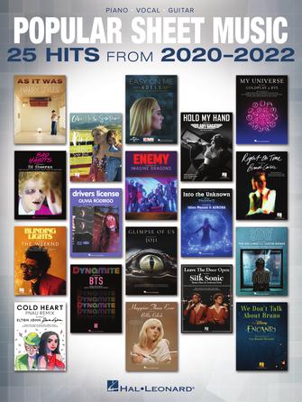 Popular Sheet Music 25 Hits from 2020-2022 Publisher: Hal Leonard Category: Keyboard & Piano/Vocal/Guitar Series: Piano/Vocal/Guitar Songbook Format: Softcover This song collection features the hottest hits from the past three years from some of its top stars: Adele, Brandi Carlile, Billie Eilish, BTS, Rihanna, Olivia Rodrigo, Ed Sheeran, Harry Styles, Taylor Swift, and more! Songs include: Anti-Hero · As It Was · Bad Habits · Blinding Lights · Cold Heart (PNAU Remix) · Drivers License · Dynamite · Easy on Me · Happier Than Ever · We Don't Talk About Bruno · and more. Listen to a Spotify playlist of all the songs from this book! (https://open.spotify.com/playlist/0y5jv09WwV81nL2Kl6EUSv) Inventory # : 01174075 UPC: 196288125792 ISBN: 1705190197 Width: 9" Length: 12" Height: 0.431" Product Weight: 1.3 lbs. Number of Pages: 168