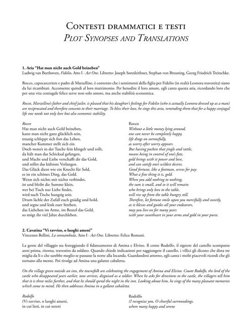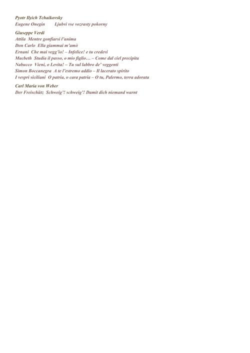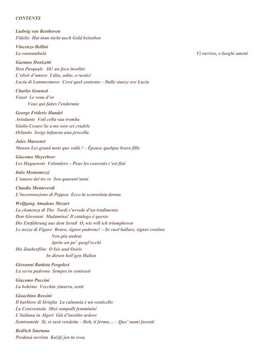 LUDWIG VAN BEETHOVEN Fidelio Hat man nicht auch Gold beineben · VINCENZO BELLINI La sonnambula Vi ravviso, o luoghi ameni · GAETANO DONIZETTI Don Pasquale Ah! un foco insolito · L'elisir d'amore Udite, udite, o rustici · Lucia di Lammermoor Cessi quel contento - Dalle stanze ove Lucia · CHARLES GOUNOD Faust Le veau d'or · Vous qui faites l'endormie · GEORGE FRIDERIC HANDEL Ariodante Voli colla sua tromba · Giulio Cesare Se a me non sei crudele · Orlando Sorge infausta una procella · JULES MASSENET Manon Les grand mots que voilà ! - Épouse quelque brave fille · GIACOMO MEYERBEER Les Huguenots Volontiers - Pour les couvents c'est fini · ITALO MONTEMEZZI L'amore dei tre re Son quarant'anni · CLAUDIO MONTEVERDI L'incoronazione di Poppea Ecco la sconsolata donna · WOLFGANG AMADEUS MOZART La clemenza di Tito Tardi s'avvede d'un tradimento · Don Giovanni Madamina! Il catalogo è questo · Die Entführung aus dem Serail O, wie will ich triumpheren · Le nozze di Figaro Bravo, signor padrone! - Se vuol ballare, signor contino · Non più andrai · Aprite un po' quegl'occhi · Die Zauberflöte O Isis und Osiris · In diesen heil'gen Hallen · GIOVANNI BATTISTA PERGOLESI La serva padrona Sempre in contrasti · GIACOMO PUCCINI La bohème Vecchia zimarra, senti · GIOACHINO ROSSINI Il barbiere di Siviglia La calunnia è un venticello · La Cenerentola Miei rampolli femminini · L'italiana in Algeri Già d'insolito ardore · Semiramide Sì, vi sarà vendetta - Deh, ti ferma... - Que' numi furenti · BEDRICH SMETANA Prodana nevesta Kadý jen tu svou · PYOTR IL'YICH TCHAIKOVSKY Eugene Onegin Ljubvi vse vozrasty pokorny · GIUSEPPE VERDI Attila Mentre gonfiarsi l'anima · Don Carlo Ella giammai m'amò · Ernani Che mai vegg'io! - Infelice! e tu credevi · Macbeth Studia il passo, o miofiglio- Come dal ciel precipita · Nabucco Vieni, o Levita! - Tu sul labbro de' veggenti · Simon Boccanegra A te l'estremo addio - Il lacerato spirito · I vespri siciliani O patria, o cara patria - O tu, Palermo, terra adorata · CARL MARIA VON WEBER Der Freischütz Schweig'! schweig'! Damit dich niemand warnt