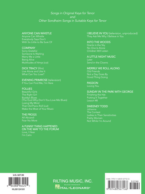 The most comprehensive, multi-volume collection of Sondheim songs ever published. Each volume has a different contents list. The volumes include songs in original keys, and appropriate transpositions. Each volume includes an extensive introductory section, with plot synopses and comments from Sondheim about songs and shows. Contents: All Aboard! (from THE FROGS) · Anyone Can Whistle (from ANYONE CAN WHISTLE) · Beautiful Girls (from FOLLIES) · Being Alive (from COMPANY) · Buddy's Blues (The God-Why-Don't-You-Love-Me Blues) (from FOLLIES) · Children Will Listen (from INTO THE WOODS) · The Contest (from SWEENEY TODD) · Everybody Says Don't (from ANYONE CAN WHISTLE) · Fear No More (from THE FROGS) · Finishing The Hat (from SUNDAY IN THE PARK WITH GEORGE) · Giants In The Sky (from INTO THE WOODS) · Good Thing Going (from MERRILY WE ROLL ALONG) · I'm Calm (from A FUNNY THING HAPPENED ON THE WAY TO THE FORUM) · If You Can Find Me, I'm Here (from the TV Production EVENING PRIMROSE) · Johanna (from SWEENEY TODD) · Ladies In Their Sensitivities (from SWEENEY TODD) · Later (from A LITTLE NIGHT MUSIC) · Lesson #8 (from SUNDAY IN THE PARK WITH GEORGE) · Live Alone And Like It (from the Film DICK TRACY) · Losing My Mind (from FOLLIES) · Love, I Hear (from A FUNNY THING HAPPENED ON THE WAY TO THE FORUM) · Loving You (from PASSION) · Make The Most Of Your Music (1987) (from FOLLIES) · Marry Me A Little (from COMPANY) · Multitudes Of Amys (from COMPANY) · No One Is Alone - Part I (from INTO THE WOODS) · Not A Day Goes By (from MERRILY WE ROLL ALONG) · Not While I'm Around (from SWEENEY TODD) · Old Friends (from MERRILY WE ROLL ALONG) · Pretty Women (from SWEENEY TODD) · Putting It Together (from SUNDAY IN THE PARK WITH GEORGE) · The Right Girl (from FOLLIES) · Send In The Clowns (from the Musical A LITTLE NIGHT MUSIC) · Someone Is Waiting (from COMPANY) · Sorry - Grateful (from COMPANY) · That Old Piano Roll (from FOLLIES) · They Ask Me Why I Believe In You · What Can You Lose (from the Film DICK TRACY) · With So Little To Be Sure Of (from ANYONE CAN WHISTLE)